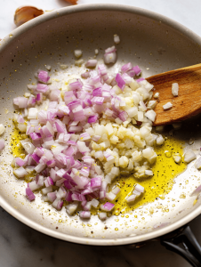 - While the pasta cooks, heat olive oil in a skillet over medium heat. Sauté chopped onions and minced garlic until they become fragrant and translucent, about 2-3 minutes, filling the kitchen with a savory aroma.
