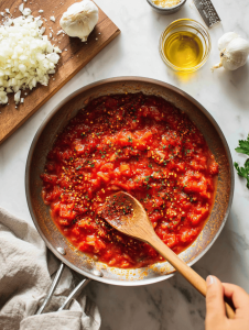 Step 5: Add marinara sauce, a pinch of red pepper flakes, and simmer for 10 minutes.