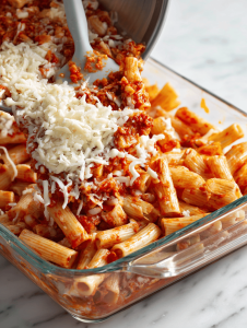 - Transfer the pasta mixture to a baking dish, spreading it out evenly. Top with the remaining mozzarella cheese and sprinkle grated Parmesan over the top for added flavor and a golden crust.