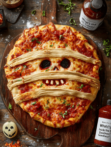 - Slice the pizza and serve immediately, enjoying the crispy crust, gooey cheese, and playful mummy design.