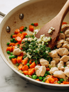 - Add the cooked chicken, peas, and diced carrots to the skillet, stirring to combine and warm through for about 5 minutes.