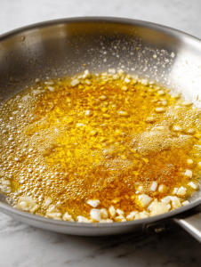 - In a large skillet, melt a bit of butter over medium heat until it starts to smell nutty and becomes fragrant.