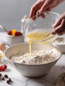 - In a mixing bowl, whisk together the flour and baking powder until evenly combined. In a separate bowl, beat the eggs and then stir in the milk until smooth. Pour the wet ingredients into the dry and gently fold until just combined, leaving a few lumps for a light batter.