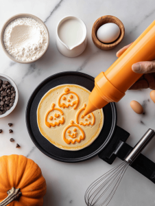 - Pour a small amount of batter onto the hot griddle to form a base for your Halloween faces or shapes. Use squeeze bottles or piping bags filled with different colored batter to draw faces, ghosts, or spooky designs directly onto the pancake surface.