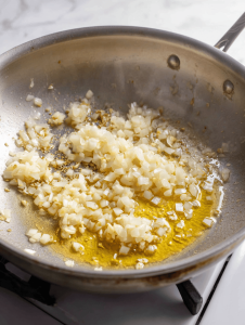 - While the potatoes cook, heat oil in a skillet over medium heat. Add chopped onion and minced garlic, sauté until fragrant and translucent, about 5 minutes, filling your kitchen with a warm aroma.