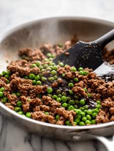 Step 4: Add 500g ground beef, cook until browned, about 8 minutes. Stir in a splash of Worcestershire sauce and a handful of frozen peas, cook for another 2 minutes.