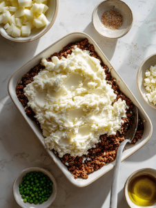- Spread the savory beef mixture evenly in an ovenproof dish, smoothing the top with a spatula. Dollop the mashed potatoes over the filling and gently spread to cover completely.