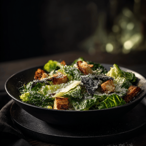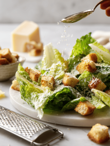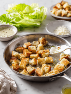 - Sprinkle the toasted croutons over the dressed lettuce, then add more Parmesan on top for extra flavor and crunch.