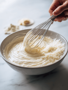 Step 3: Add the mayonnaise and Parmesan, whisk until smooth. It should smell sharp, cheesy, with a hint of garlic.
