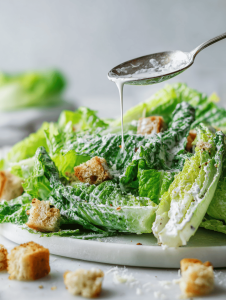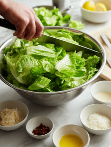Step 4: Toss the romaine leaves in the dressing, ensuring every leaf gets coated. Add croutons and more Parmesan on top.