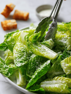 - Toss the lettuce in the dressing, ensuring each leaf gets coated in the bold, salty sauce. The leaves should glisten and feel slightly sticky from the dressing.