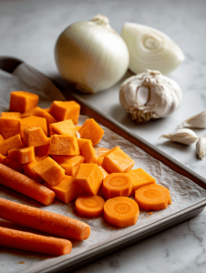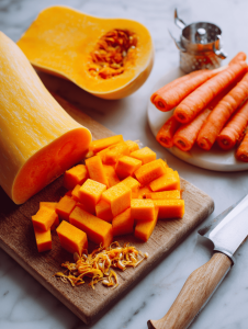 Step 2: Peel and chop 1 butternut squash and 3 carrots into uniform pieces for even roasting.