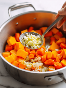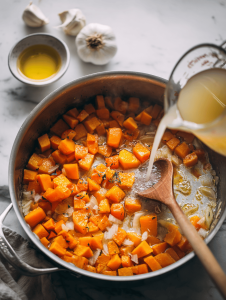 Step 6: Add roasted squash and carrots to the pot, pour in 4 cups of vegetable broth, bring to a simmer.