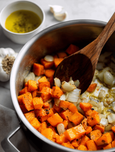 - While the vegetables roast, chop the onion and garlic. Sauté them in a large pot with a tablespoon of olive oil over medium heat until fragrant and translucent, about 5 minutes.