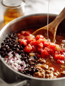 - Pour in the diced tomatoes along with their juices, and add the drained black beans and vegetable broth. Stir everything together, scraping up any browned bits from the bottom of the pot for extra flavor.