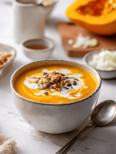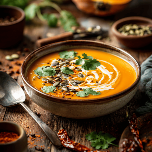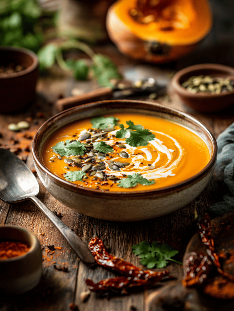 Step 10: Serve hot, garnished with toasted pumpkin seeds or a swirl of coconut cream.