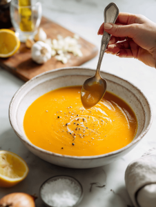 - Serve the soup hot, garnished with toasted pumpkin seeds, a drizzle of coconut cream, or a squeeze of fresh lemon for an extra zing.