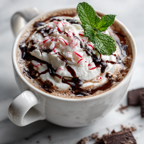 Step 5: Top with whipped cream, a drizzle of chocolate syrup, and a tiny sprig of fresh mint for that perfect finishing touch.