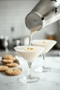 - Place a strainer over your chilled martini glass and pour the mixture, catching any ice shards or cookie crumbs.