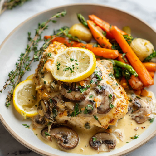 Chicken Supreme is a tender, juicy chicken breast dish baked with a creamy mushroom sauce, resulting in a rich and velvety texture. The dish involves searing the chicken to lock in flavors, then baking it with the sauce until perfectly cooked and golden. The final appearance is a beautifully browned chicken topped with a luscious, mushroom-infused coating.