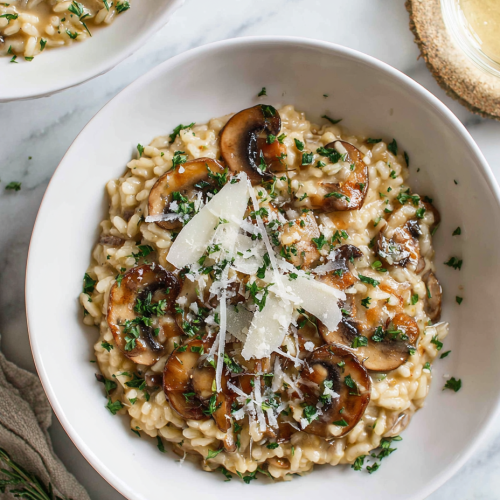 Risotto is best served immediately while velvety and hot, with a fragrant aroma of mushrooms and cheese filling the room.