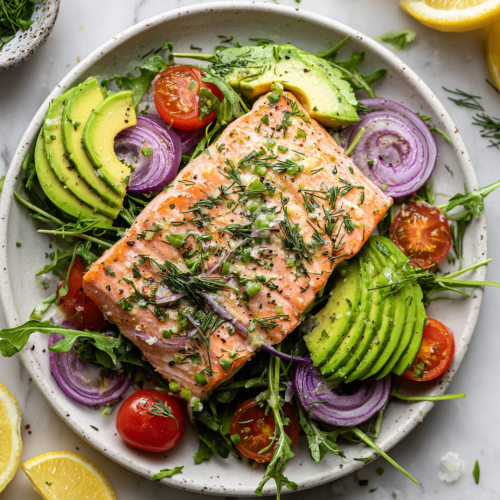Salmon is not only delicious but also incredibly healthy. It’s packed with omega-3 fatty acids, which are known for their heart-healthy benefits. It’s also a great source of protein, making it a perfect addition to any meal. The rich, tender texture of salmon complements the fresh greens and creamy avocado in this salad, making it a balanced and flavorful dish.