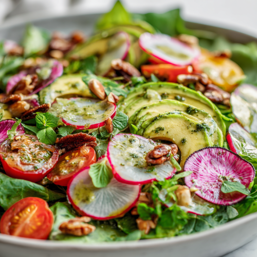 Let’s talk about avocado. It’s the perfect addition to any salad, bringing richness and a healthy dose of fats. Avocado helps absorb the fat-soluble vitamins from the greens and herbs, making your salad not only more filling but also more nutritious. Plus, its creamy texture balances the crispness of the mixed greens and toasted nuts.